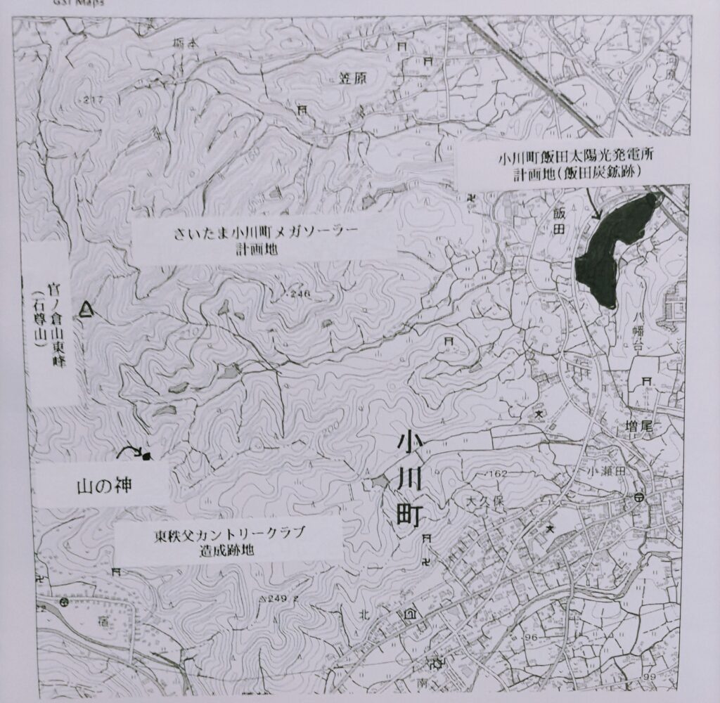 同じく官ノ倉山周辺で計画されている太陽光発電設備の設置計画であり、しかもほぼ同時期に計画が進められているにもかかわらず、飯田炭鉱跡の計画(飯田太陽光発電所計画)は、「さいたま小川町メガソーラー設置計画」の陰にかくれることになった。