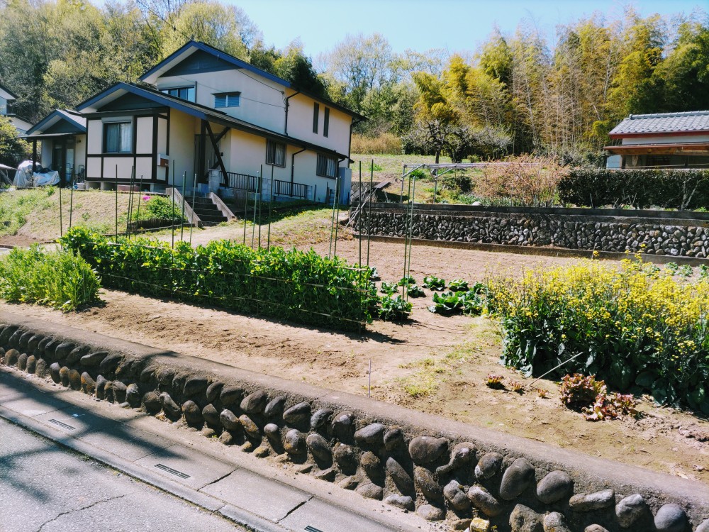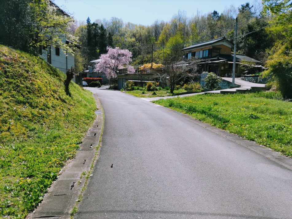 集落は町道を境に左右に分かれるが、進行方向の右側(西側)は雑木林の山林を背に人家や畑が点在するのどかな集落であり、このとき(2026年4月8日)、桜が満開だった。